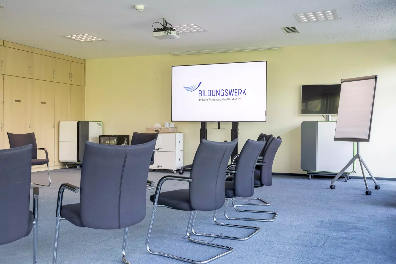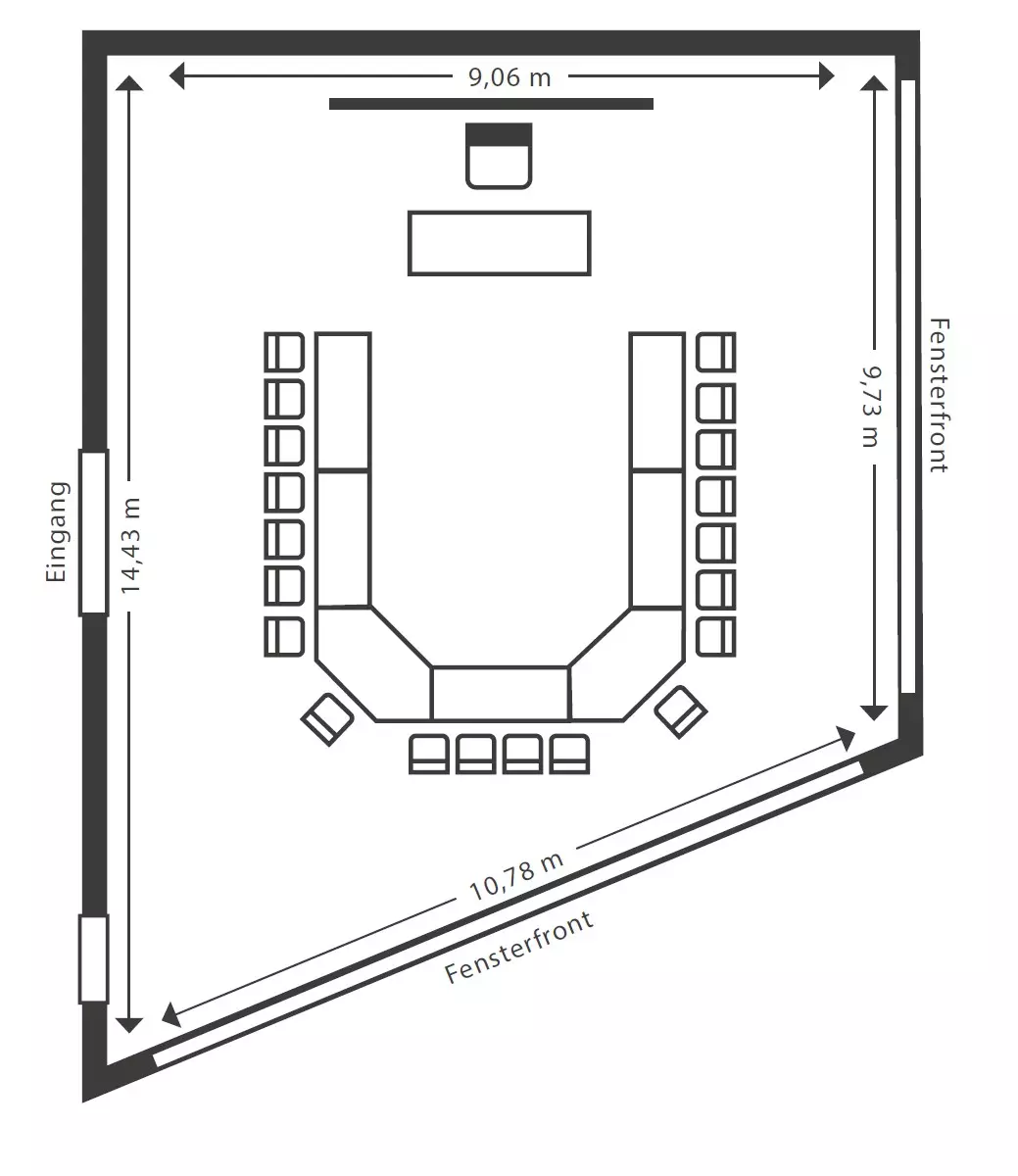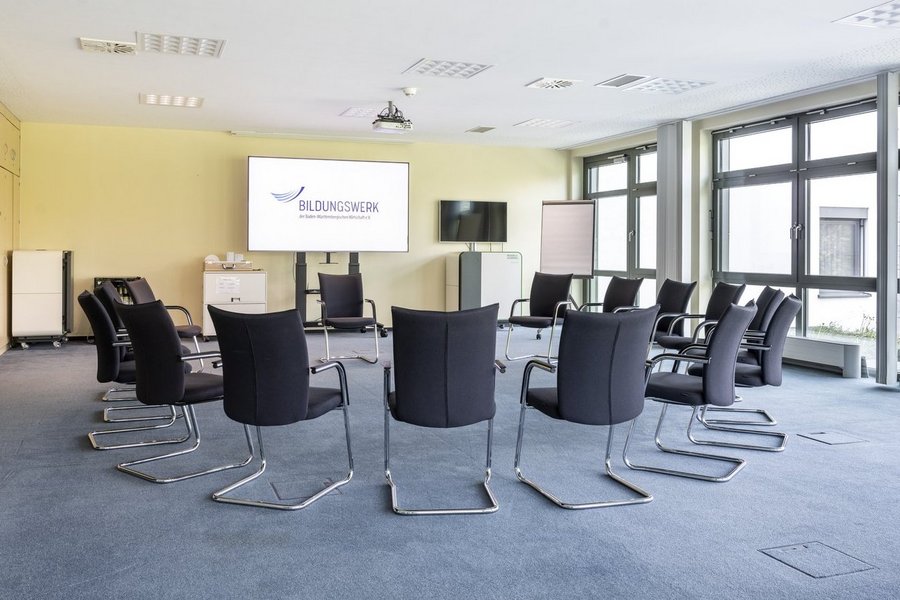 Willkommen im Seminarraum 4 – Ein großzügiger, lichtdurchfluteter Raum mit 107 m² und direktem Blick ins Grüne. Er bietet Platz für bis zu 30 Personen in Stuhlreihen mit Mittelgang oder 26 Personen in ovaler Bestuhlung. Ausgestattet mit modernster Raum- und Präsentationstechnik eignet er sich ideal für vielseitige Veranstaltungen.