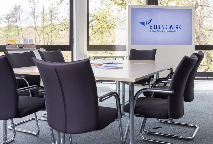 Willkommen im Seminarraum 5 – Ein heller, klimatisierter Raum mit 84 m² und Blick ins Grüne. Er bietet Platz für bis zu 15 Personen in Stuhlreihen oder 14 Personen in U-Form. Mit einer modernen Präsentations-Stele ausgestattet, ist er ideal für professionelle Meetings und Veranstaltungen.